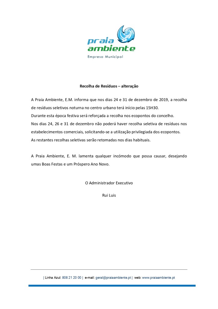 Devido à quadra natalícia, a recolha de resíduos seletivos noturna no centro urbano da Praia da Vitória é antecipada para as 15:30, nos dias 24 e 31 de dezembro, véspera de Natal e Ano Novo, informa a empresa municipal Praia Ambiente, EM, em comunicado.
