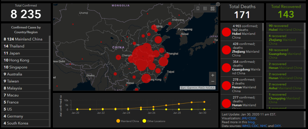 Segundo dados do portal “Mapping 2019-nCoV“, no momento de redação do presente texto há 9.776 casos confirmados laboratorialmente, sendo 9.658 na China, tendo-se registado 213 óbitos e 187 recuperações.