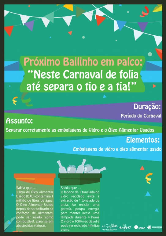 Folia na diversão, responsabilidade na Ação – assim se quer e se deseja o Entrudo terceirense, pelo que, pelo terceiro ano consecutivo os Serviços Municipalizados de Angra do Heroísmo (SMAH), em parceria com a Resiaçores, apostam na campanha temática de recolha de resíduos diferenciados, sob o lema “Em Carnaval de Folia, Até Separa o Tio e a Tia!” Uma campanha que se tornou, desde a primeira edição, uma aposta ganha e que se quer, por isso, anual.