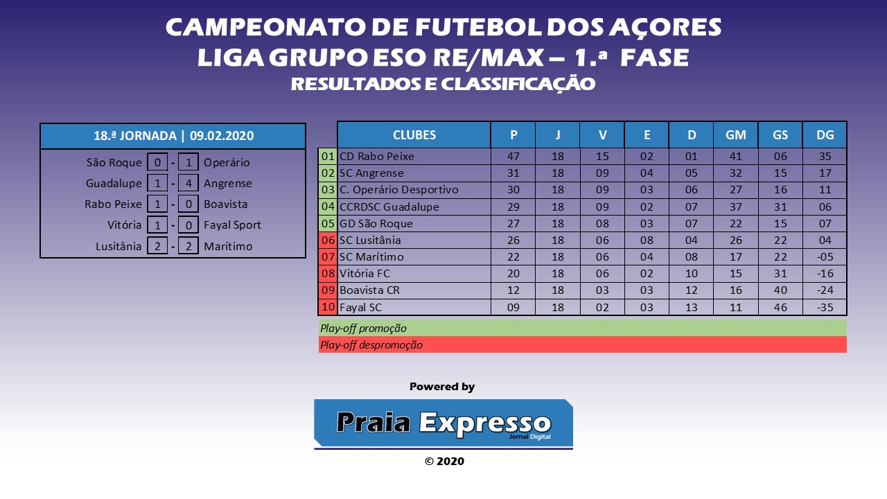 Completou-se hoje a 18.ª e última jornada da 1.ª fase do Campeonato de Futebol dos Açores – Liga Grupo ESO RE/MAX. Na segunda fase, cujo sorteio realizar-se-á no próximo sábado, 15 de fevereiro, na ilha Graciosa, as 10 equipas participantes subdividem-se em dois grupos: os primeiros 5 no grupo de promoção que irá decidir qual o clube açoriano a participar na próxima época no Campeonato de Portugal e os últimos 5 no grupo de Manutenção, tendo em vista apurar os clubes despromovidos ao futebol de ilha, sendo que o número de clubes a baixar de nível competitivo está diretamente dependente do número de equipas açorianas despromovidas da prova federativa.