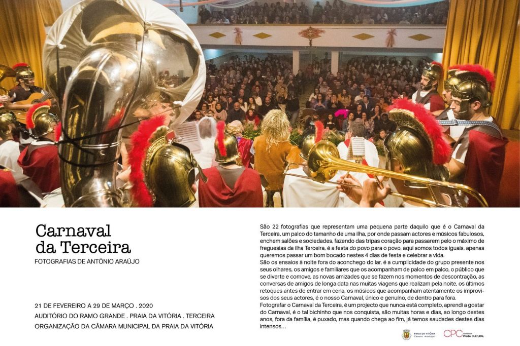 A partir de amanhã, sexta-feira, 21 de fevereiro, estará patente ao público no foyer do Auditório do Ramo Grande (ARG), a exposição de fotografia “Carnaval da Ilha Terceira” de António Araújo. A mostra poderá ser apreciada nas duas horas que antecedem os espetáculos a acontecer no ARG e ficará patente até ao próximo dia 29 de março.