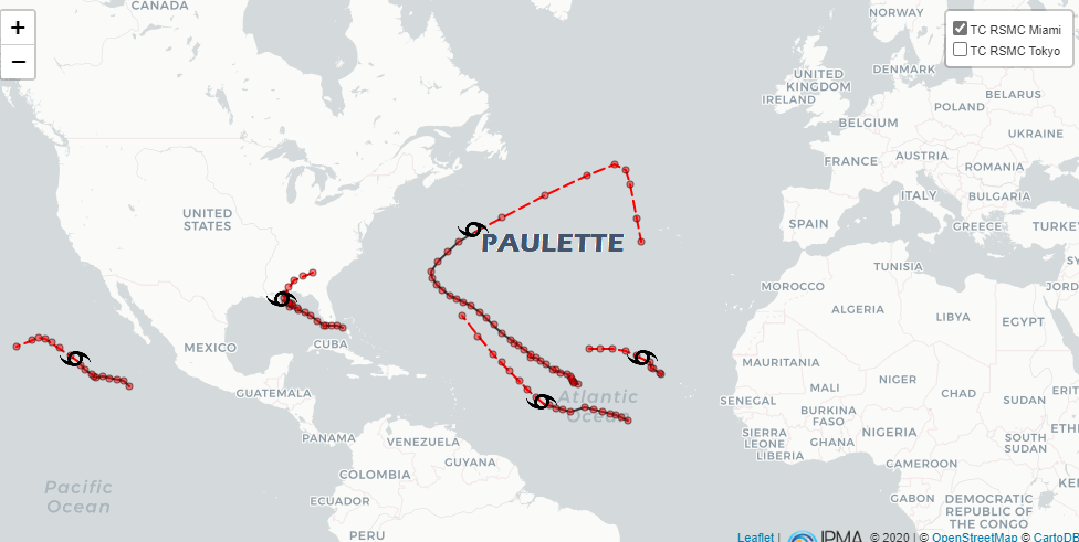 Segundo informa o Instituto Português da Atmosfera e do Mar (IPMA), em comunicado, o furacão PAULETTE encontrava-se hoje, 15 de novembro, às 15:00 UTC (hora dos Açores) a 915 km a nordeste (NE) das Bermudas, com uma pressão mínima no seu centro de 965 mb, prevendo-se que nos próximos dias se mantenha com deslocamento para nordeste (NE).