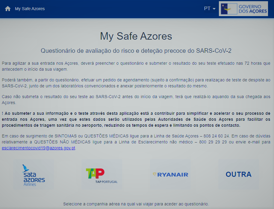 Esta solução, disponível em https://mysafeazores.com/, permite concretizar, numa só interação e antecipadamente, todos os passos que o viajante deve seguir à sua chegada à Região.