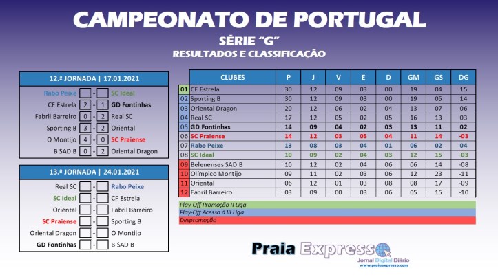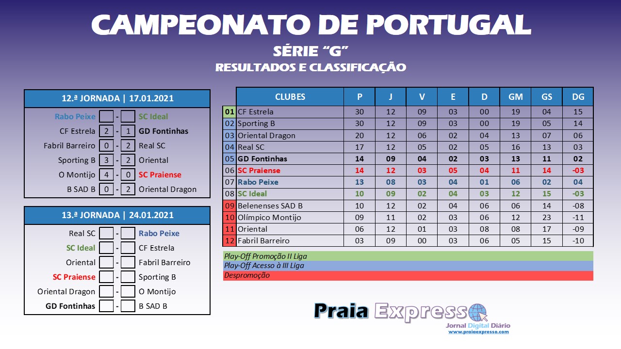 Resultados da 12ª jornada do Campeonato de Portugal, série “G”, disputada este fim de semana bem como tabela classificativa após a mesma e quadro dos jogos agendados para a próxima ronda.