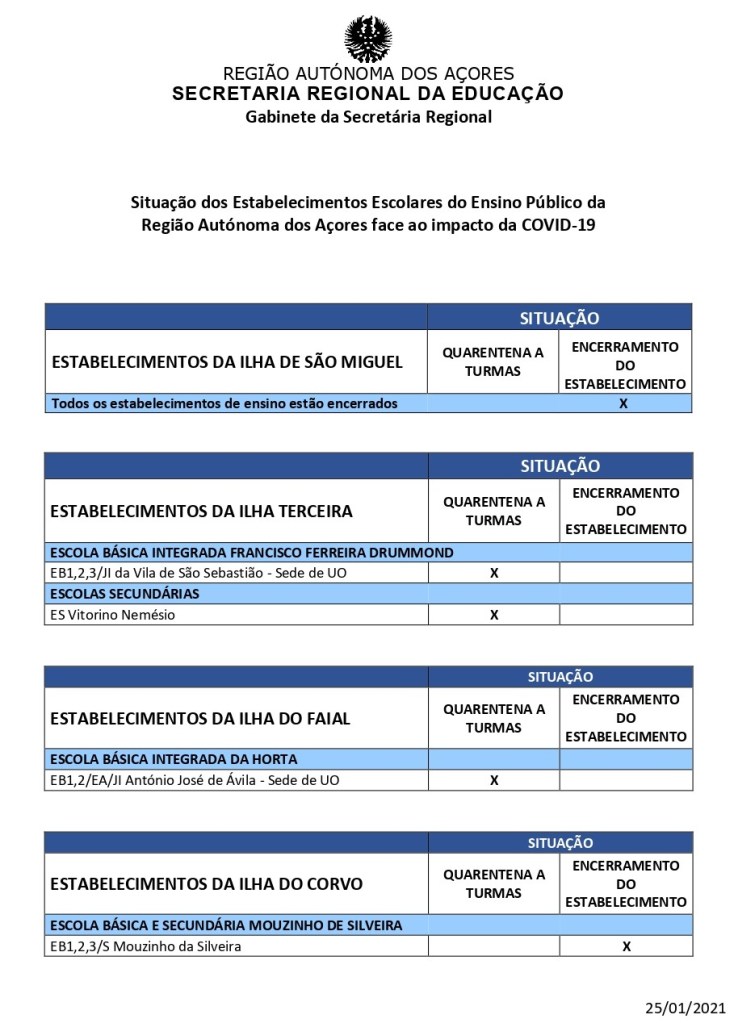 No que diz respeito à ilha do Faial, o bloco do Jardim Infantil e do 1º Ciclo da Escola Básica António José de Ávila estão encerrados segunda e terça-feira, 25 e 26 de janeiro e, na ilha do Corvo, a Escola Básica e Integrada Mouzinho da Silveira está encerrada, aguardando os resultados laboratoriais de testes à Covid-19.