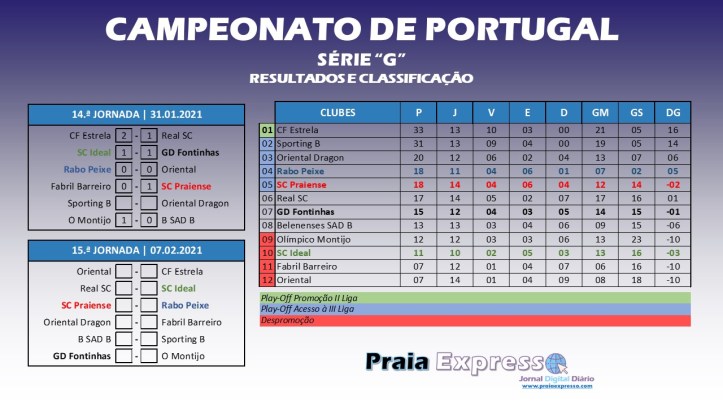 Disputou-se este fim de semana mais uma jornada da 1.ª fase do Campeonato de Portugal, em futebol, a 14.ª correspondente à terceira da segunda volta. Na imagem abaixo, quadro dos resultados da série “G”, onde militam os emblemas do Açores, assim como tabela classificativa após a mesma e quadro dos jogos alinhados para próxima ronda.