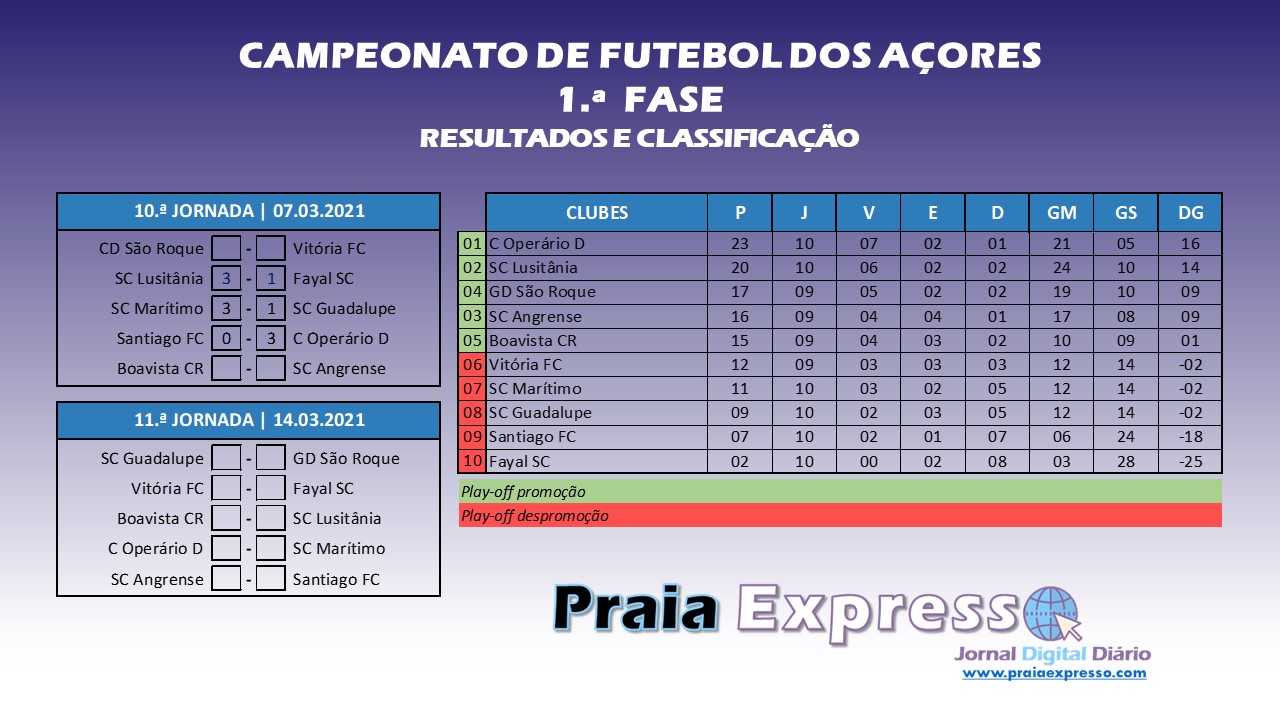 Disputou-se este fim de semana a 10.ª e primeira jornada da segunda volta, da primeira fase, do Campeonato de Futebol dos Açores. Na imagem abaixo, quadro de resultados da jornada, classificação após a mesma e jogos agendados para a próxima ronda (11.ª).