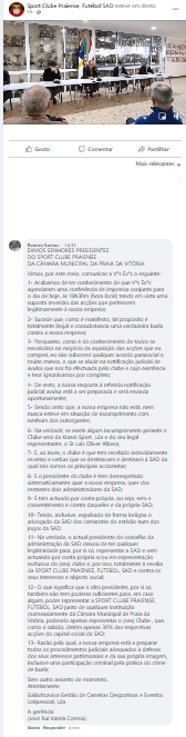 No comentário, constituído por 13 pontos, colocado pelo advogado Ramiro Santos, é notório o mal-estar entre a SAD e a Direção, terminando o mesmo com o acionista a afirmar que “está a preparar todos os procedimentos judiciais adequados á defesas dos seus interesse patrimoniais e da sua própria imagem, inclusive uma participação criminal pela prática do crime de burla”.