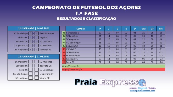 Disputou-se este fim de semana a 11.ª e primeira jornada da segunda volta, da primeira fase, do Campeonato de Futebol dos Açores. Na imagem abaixo, quadro de resultados da jornada, classificação após a mesma e jogos agendados para a próxima ronda (12.ª).