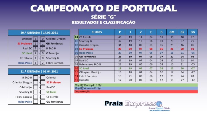 Disputou-se este fim de semana a antepenúltima jornada da primeira fase (20.ª) do Campeonato de Portugal de futebol em seniores masculinos. Na imagem abaixo, apresentamos o quadro completo dos resultados da série “G”, onde militam as equipas dos Açores, assim como tabela classificativa após a mesma e, ainda, ramalhete dos jogos agendados para a próxima jornada.