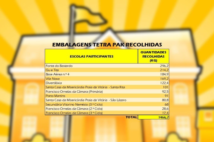 A Praia Ambiente, EM já recolheu nas escolas do concelho da Praia da Vitória 1.466,2 kg de embalagens Tetra Pak, o equivalente a mais de 48.873 embalagens de 1L, no âmbito do concurso “A Tua Escola é a Mais Amarela?”, lançado em janeiro com o objetivo de envolver a comunidade escolar na separação correta destas embalagens.