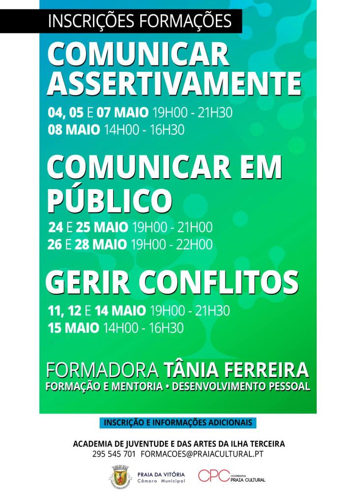 De acordo com uma nota da Câmara Municipal da Praia da Vitória, publicada na página de internet hoje consultada pelo Praia Expresso, a primeira formação “incide sobre a temática de “Comunicar Assertivamente” e irá decorrer nos dias 04, 05 e 07 de maio das 19:00 às 21:30 e no dia 08 entre as 14:00 e as 16:30. Esta formação tem como objetivo geral o aperfeiçoamento das estratégias comunicacionais a fim de se promover relações interpessoais saudáveis e duradouras”.