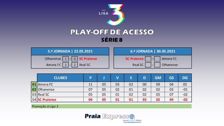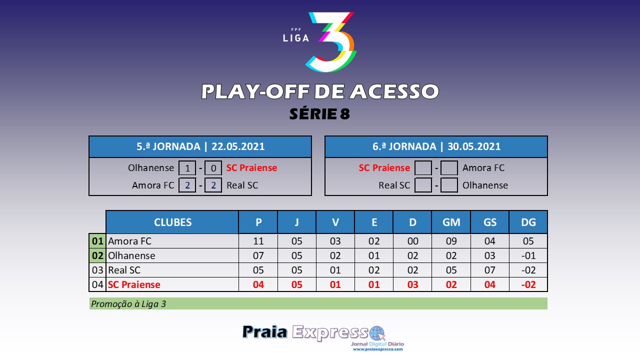 Ao perder este sábado com o Olhanense (1 — 0), o Praiense despede-se definitivamente do sonho de qualificação para a Liga 3. Já o Amora está matematicamente qualificado. Olhanense e Real podem lá chegar, tudo depende do desfecho da partida entre ambos a realizar-se na 6.ª e última ronda desta fase de apuramento.