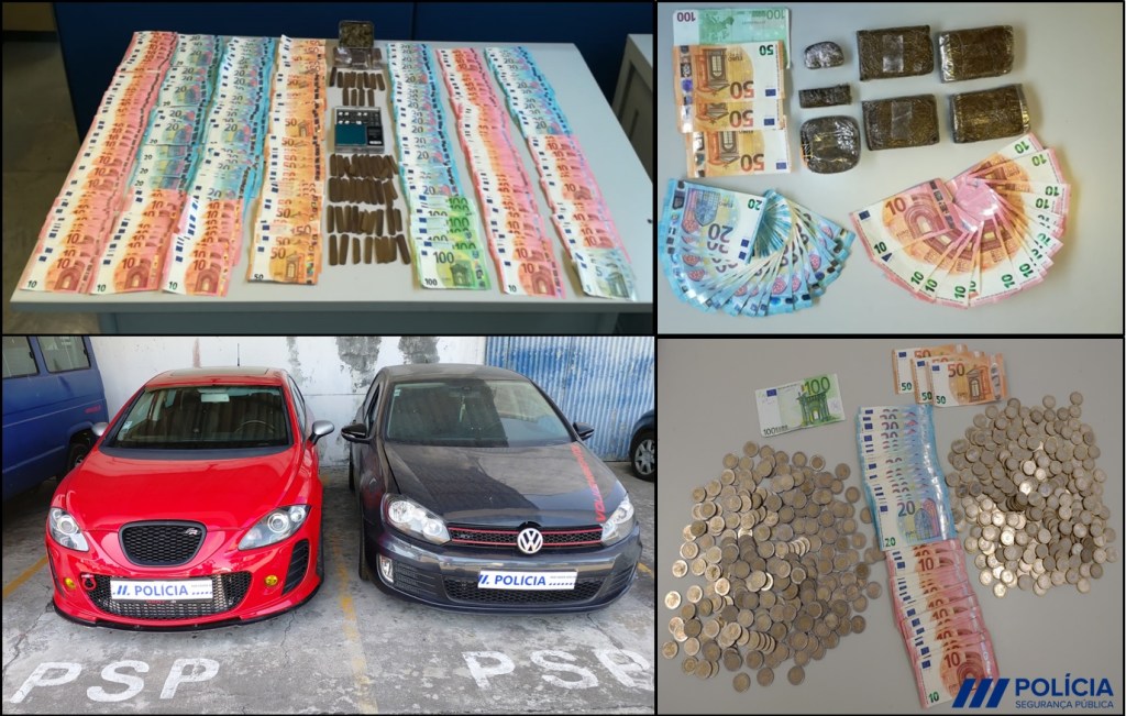 “Tais suspeitas, totalmente sustentadas aquando da realização de duas operações policiais distintas, permitiram a detenção de ambos os arguidos e a apreensão de 1.354 doses de haxixe, 30 doses de liamba, 13.810 euros e duas viaturas”, lê-se no documento.