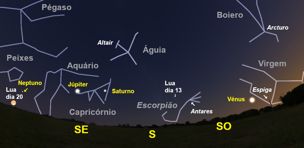 A Lua Cheia irá ocorrer ao início da madrugada de dia 21. Igualmente por estes dias será a vez de encontrarmos o planeta Mercúrio ao lado da estrela Espiga.