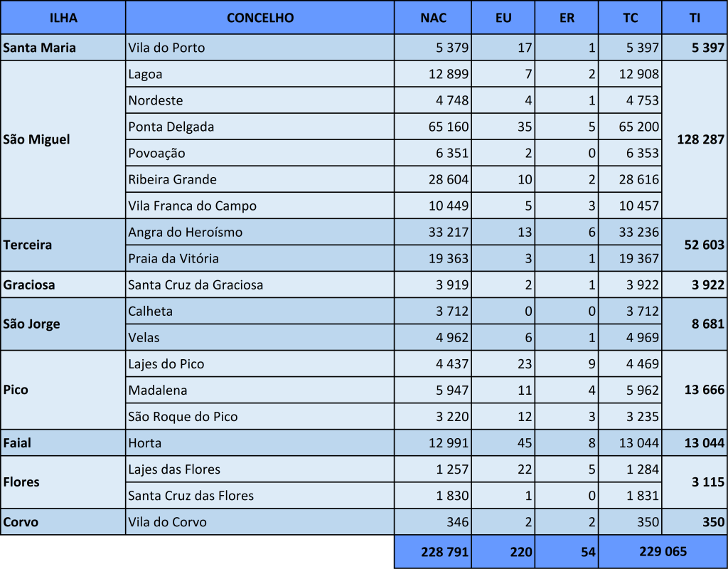 O concelho com maior número de inscritos é Ponta Delgada, representando por isso o maior município da Região Autónoma dos Açores. No sentido inverso, a autarquia de Vila do Corvo, com 350 eleitores inscritos, apresenta-se como a de menor dimensão nos Açores.