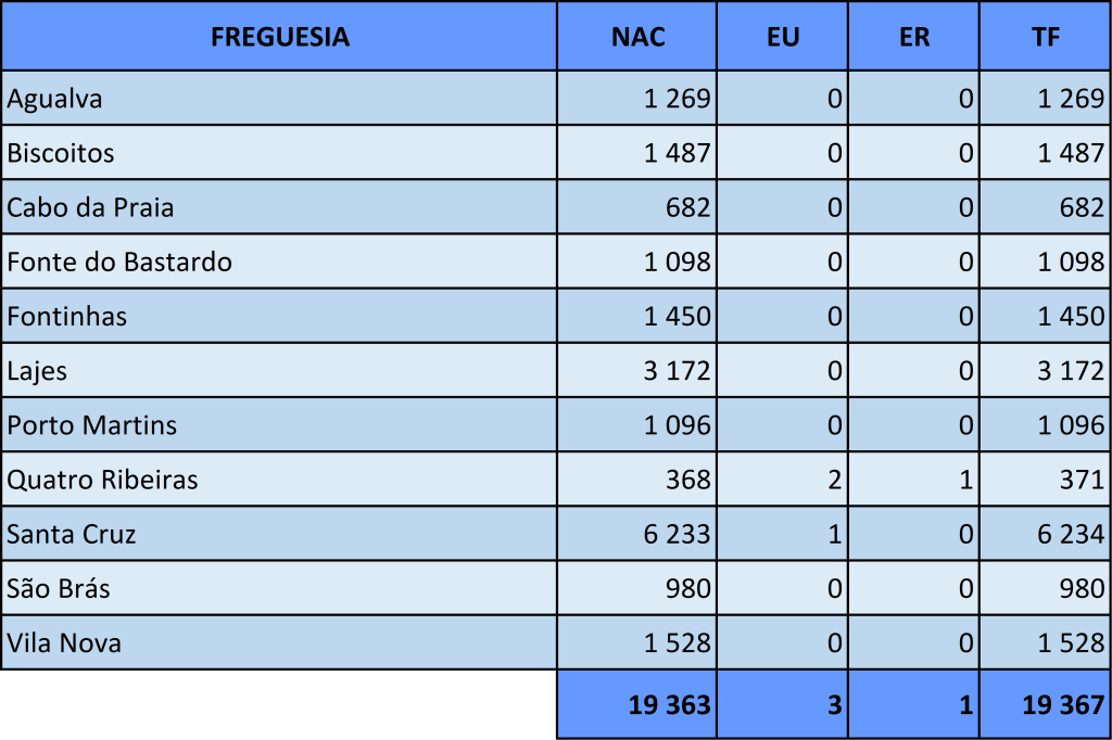 A ilha Terceira soma 16 eleitores da União Europeia e sete de outras nacionalidades. Em Angra do Heroísmo estão inscritos 19 eleitores não nacionais e na Praia da Vitória quatro.