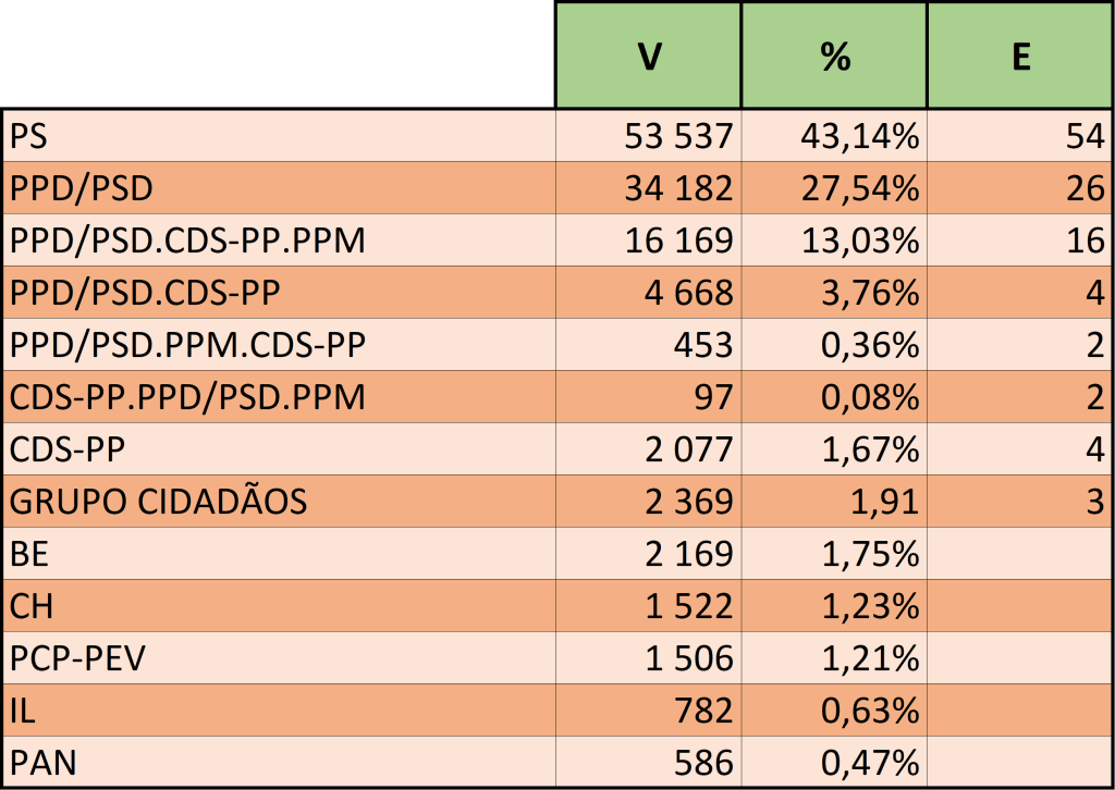 Considerando os partidos da coligação individualmente, o PSD obteve 34.182 (27,54%) votos, o CDS-PP 2.077 (1,67%) e o PPM não concorreu em qualquer município. Os três partidos coligados, nas diversas nomenclaturas, obtiveram 21.387 (17,23%) dos votos expressos.