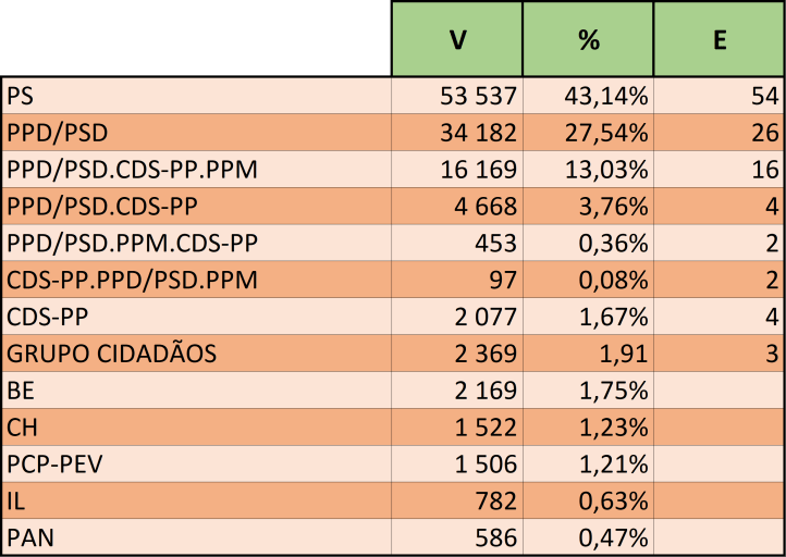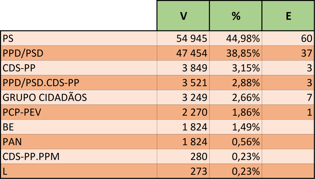 No que diz respeito ao número de votos, o PS obteve nas últimas autárquicas 53.537 (43,14%) votos, menos 1.408 em ralação a 2017 (54.945 — 44,98%).