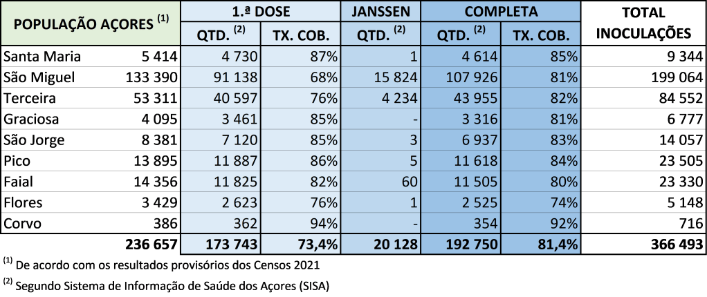 Por ilhas, a ilha do Corvo regista a maior taxa de população inoculada (92%), enquanto no sentido inverso, encontra-se a ilha das Flores com apenas 74%.