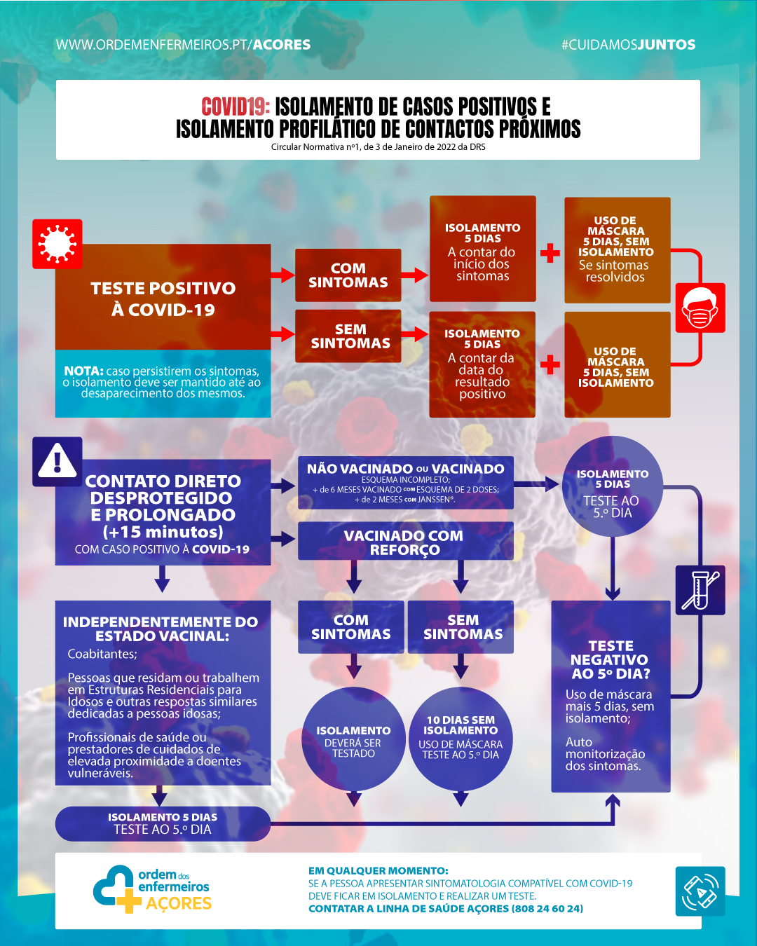 A Secção Regional dos Açores da Ordem dos Enfermeiros desenvolveu conteúdos informativos com o intuito de clarificar as orientações emanadas pela Circular Normativa nº1 de 3 de janeiro de 2021 da Direção Regional da Saúde, tendo em conta que “comportamento e a responsabilidade individual adquirem cada vez mais importância na gestão da pandemia de COVID-19”.