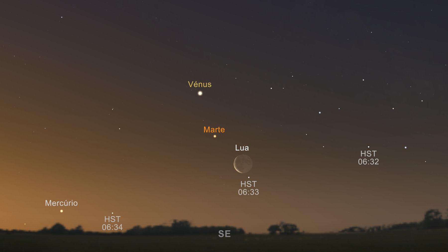Mas o desafio não termina aqui! Mercúrio está à esquerda deste quarteto, mas se a Lua, a esta hora, está a 8,5 graus acima do horizonte, Mercúrio estará apenas 2,5 graus acima do horizonte! Podem tentar observá-lo seguindo a trajetória do HST, pois às 06:34:50 este estará à mesma altura que Mercúrio, mas 6 graus à direita do planeta.