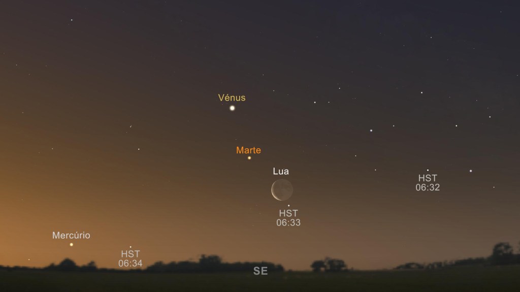 A fechar o mês, no dia 28, a Lua, que se move aproximadamente um palmo por dia no céu, vai passar a cerca de 8 graus de Mercúrio, mesmo antes do Sol nascer.