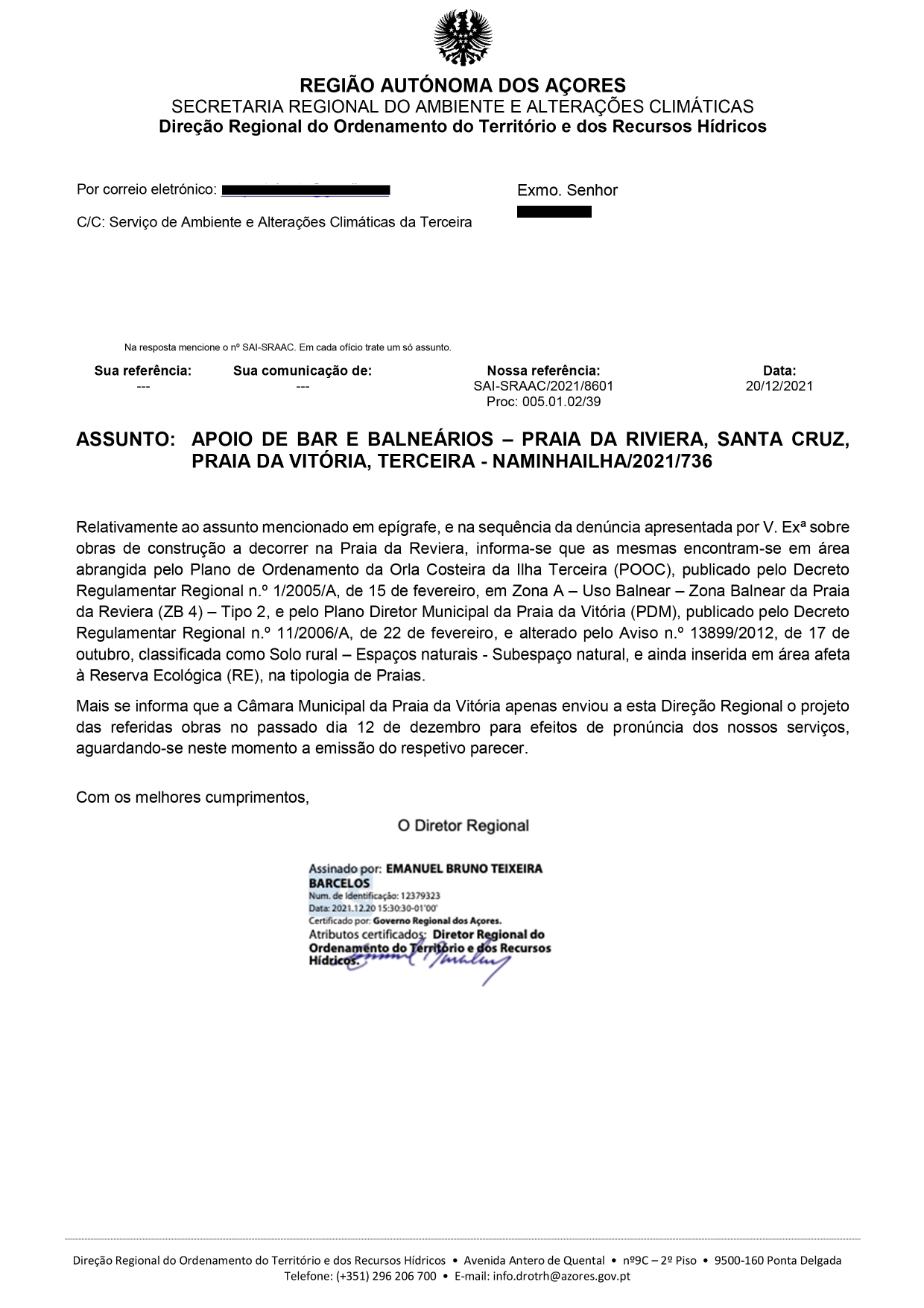 “No documento lê-se que as obras «encontram-se em área abrangida pelo Plano de Ordenamento da Orla Costeira da Ilha Terceira (POOC), publicado pelo Decreto Regulamentar Regional n.º1/2005/A, de 15 de fevereiro, em Zona A – Uso Balnear – Zona Balnear da Praia da Riviera (ZB 4) – Tipo 2»”.