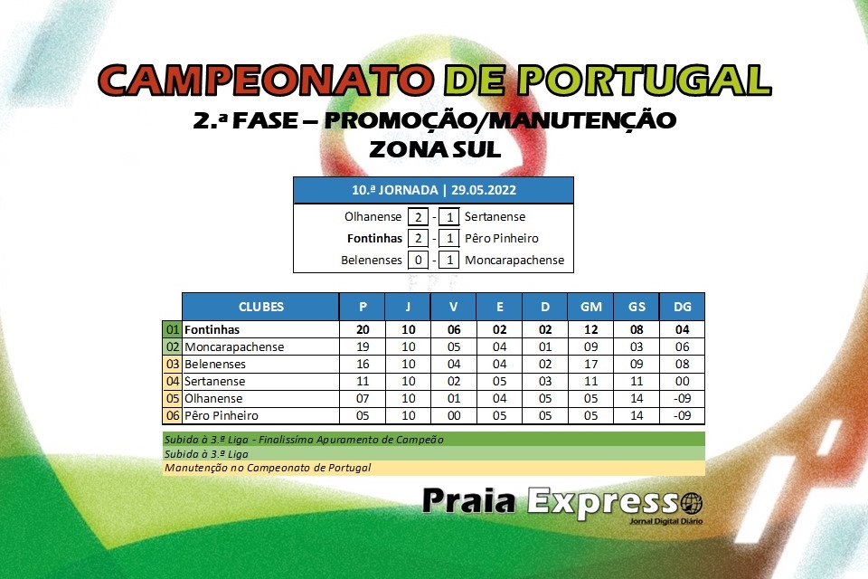 Depois de ter garantido no último domingo a subida à Liga 3, este domingo ao vencer o Pêro Pinheiro por 2 — 1, o Fontinhas voltou a fazer história, e vai estar presente no próximo sábado no Jamor, na finalíssima de apuramento de campeão 2021/22 do Campeonato de Portugal, frente ao União Sport Clube Paredes, primeiro classificado da Zona Norte.