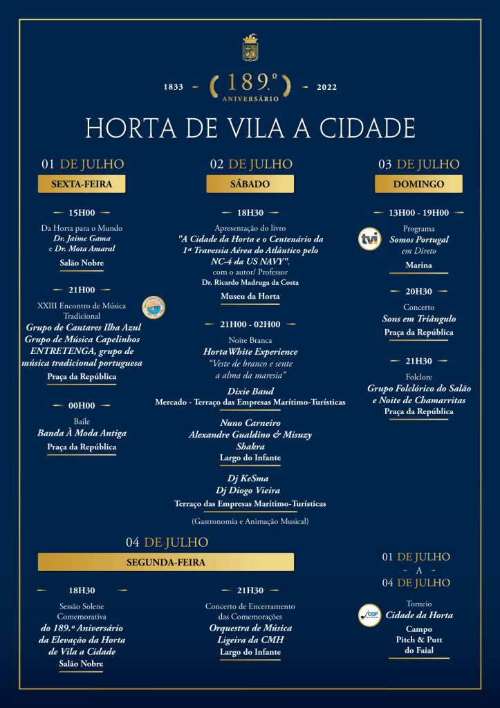 O concelho da Horta, na ilha do Faial, comemorará de 01 a 04 de julho, os 189 anos de elevação da vila da Horta a cidade, com um extenso programa comemorativo, que vai da valorização histórica à inovação.