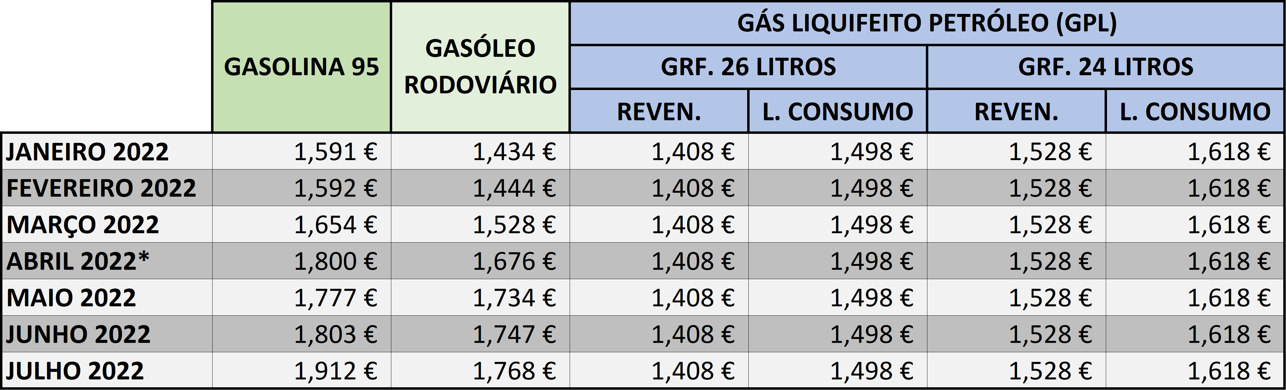 O preço do gás butano vendido em garrafas, canalizado ou em granel não sofre alterações, variando entre 1,348 euros por kg (a granel) e 1,618 por kg (garrafa de 24 litros, construída em materiais leves, vendida ao público, no local de consumo).