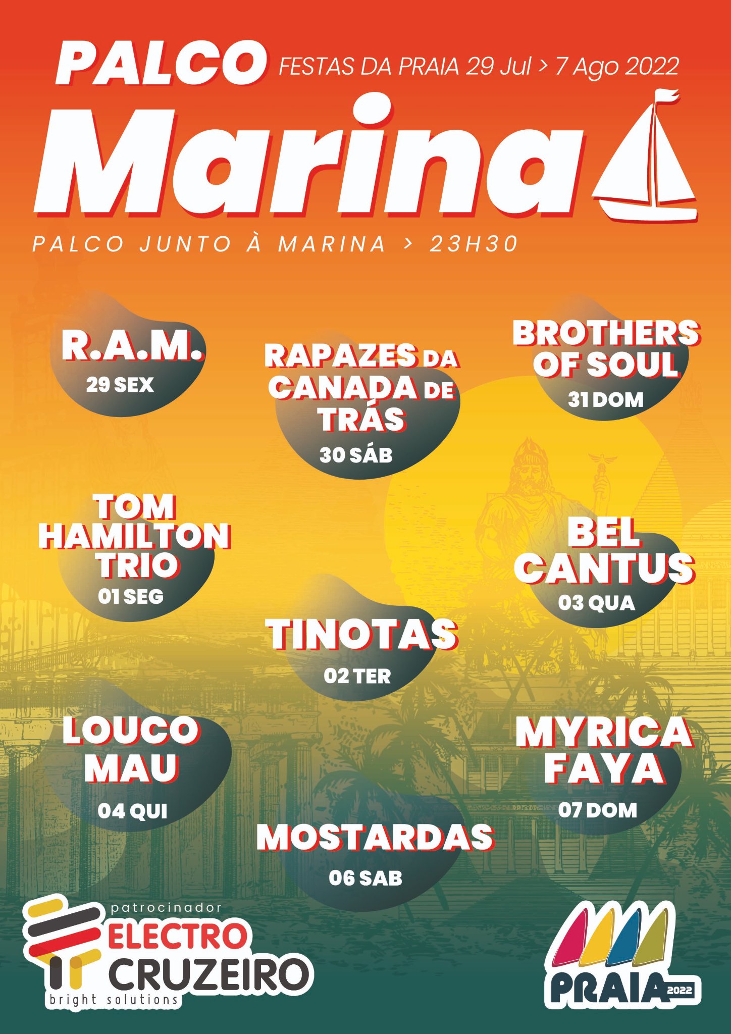 Pelo palco “Marina”, patrocinado pela empresa “Electro Cruzeiro”, situado junto da marina da cidade, passarão os RAM, Rapazes da Canada de Trás, Brothers Of Soul, Tom Hamiltn Ton Trio, Tinotas, Bel Cantus, Louco Mau, Mostardas, Myryca Faya, entre “mais novidades em breve”, anuncia a página.