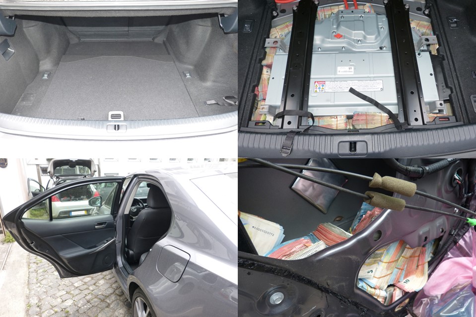 No cumprimento de mandados de busca emitidos por autoridade de polícia criminal da Polícia Judiciária, “foram encontrados dezenas de molhos de notas, escondidos por dentro do forro das portas e na bagageira do veículo, que foi igualmente apreendido”.
