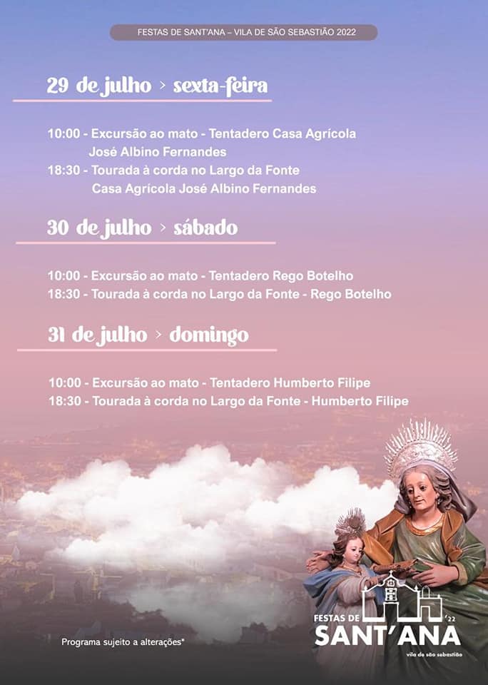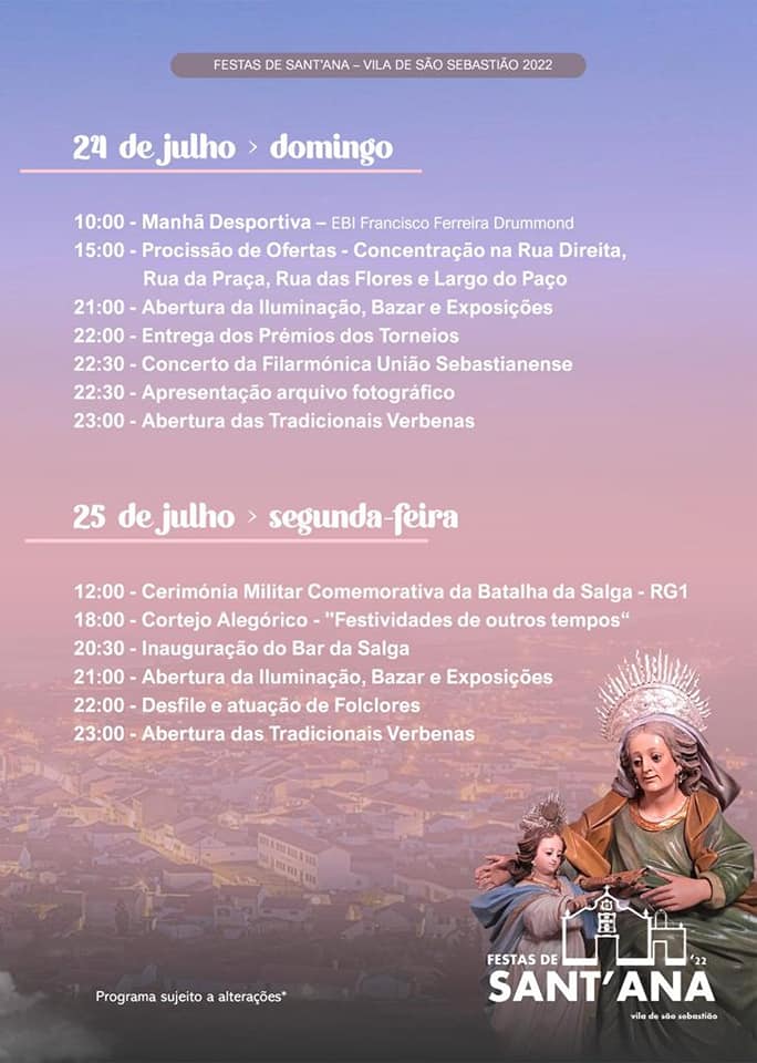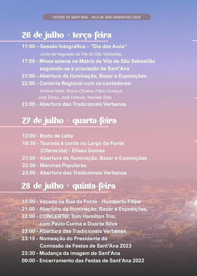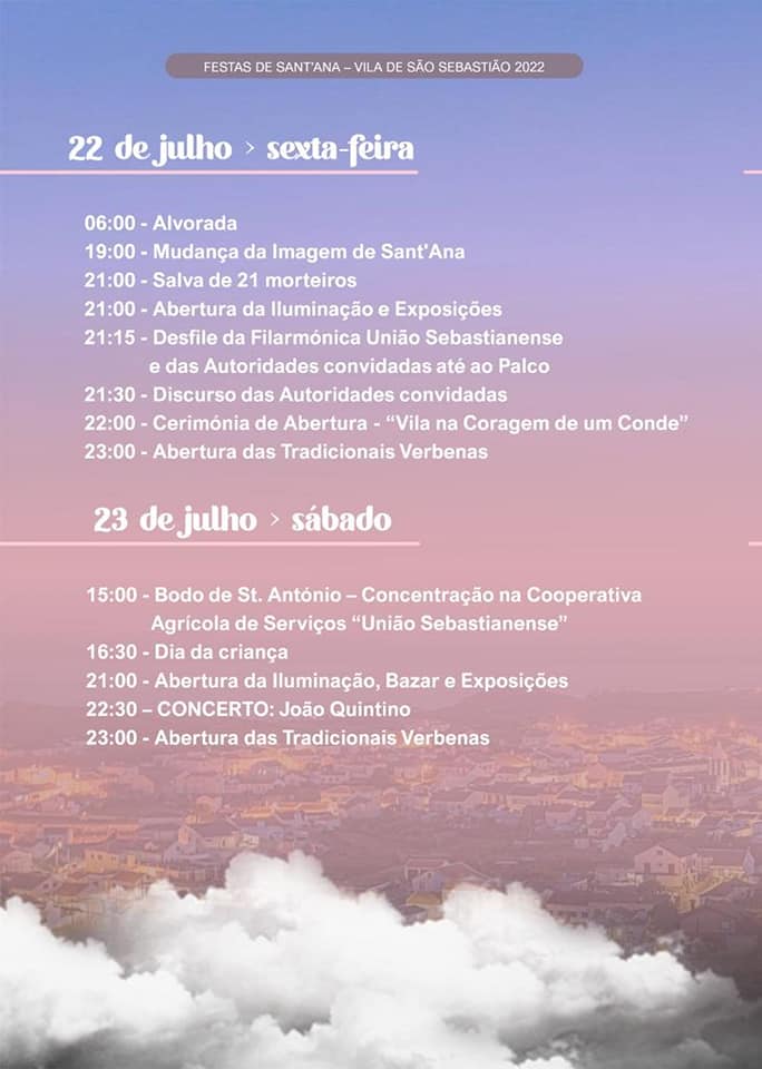 23.07.202222.07.2022 Francisco Soares FESTAS DE SANT’ANA NA VILA DE SÃO SEBASTIÃO 2022 Com início esta sexta-feira, decorre na Vila de São Sebastião até ao próximo dia 31 de julho as Festas de Sant’Ana 2022. PROGRAMA © PE | Imagens: Facebook Festas Sant’Ana Partilhar isto: Carregue aqui para imprimir (Abre numa nova janela) Imprimir Clique para partilhar no Facebook (Abre numa nova janela) Facebook Click to share on X (Abre numa nova janela) X Clique para partilhar no LinkedIn (Abre numa nova janela) LinkedIn Clique para partilhar no WhatsApp (Abre numa nova janela) WhatsApp Relacionado
