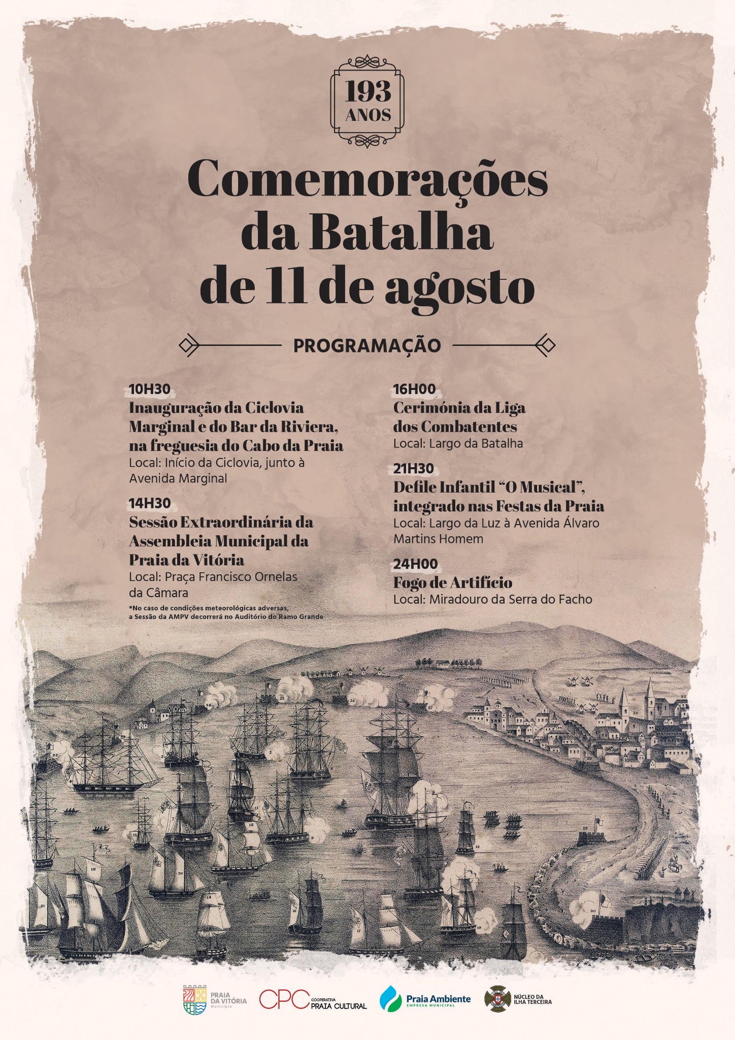 As comemorações do 193.º aniversário da batalha de 11 de agosto prosseguem às 14:30 com a sessão pública e extraordinária da Assembleia Municipal da Praia da Vitória, na Praça Francisco Ornelas da Câmara, caso as condições atmosféricas o permitam. Alternativamente, a sessão decorrerá no Auditório do Ramo Grande.