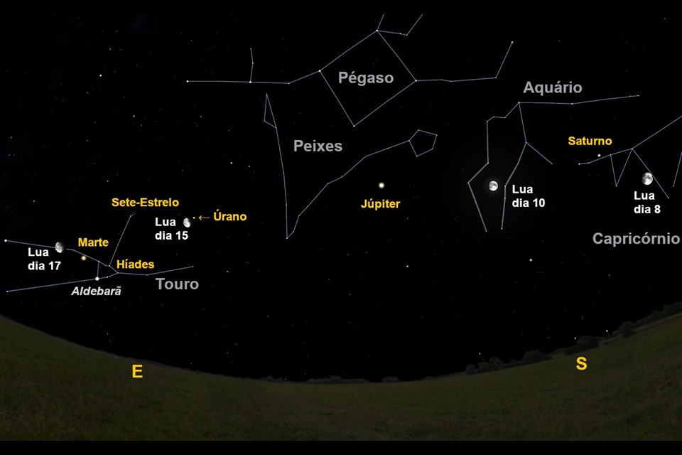 Na noite de dia 6 iremos encontrar o planeta Marte junto de Aldebarã, o olho da constelação do Touro. Nesta constelação existem dois aglomerados de estrelas que parecem moscas a enxamear um touro. As Hiades são um aglomerado de estrelas situadas na face do Touro, enquanto que as Plêiades (ou Sete-Estrelo) encontram-se no seu dorso. Este último aglomerado estelar visitado pela Lua na noite de dia 15.
