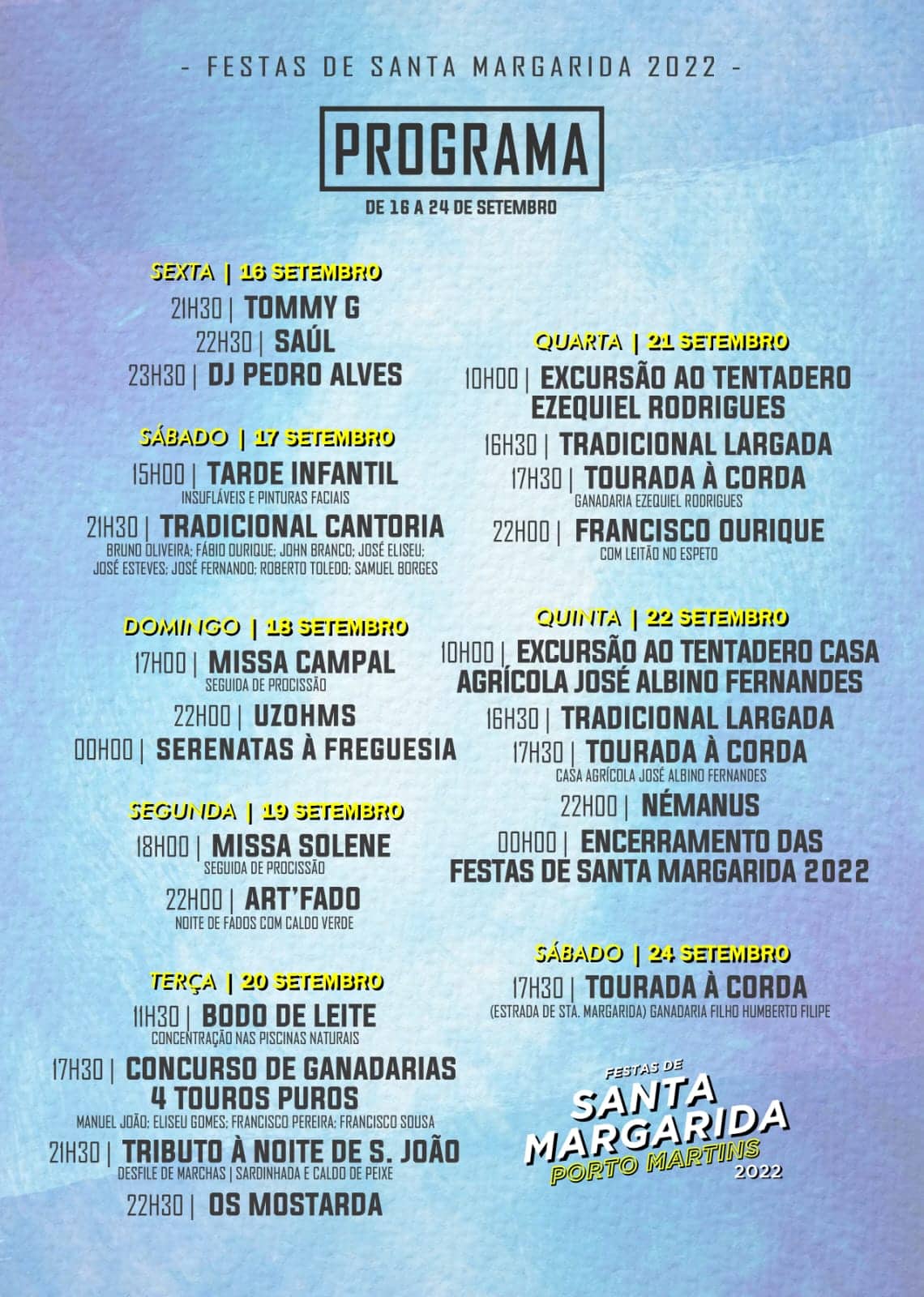 Numa festa para miúdos e graúdos, há ainda insufláveis, pinturas faciais, gastronomia, marchas populares, DJ, bodo de leite, excursão a tentadero e muito mais. Clique na imagem abaixo, para ficar a par do programa completo das Festas de Santa Catarina 2022.
