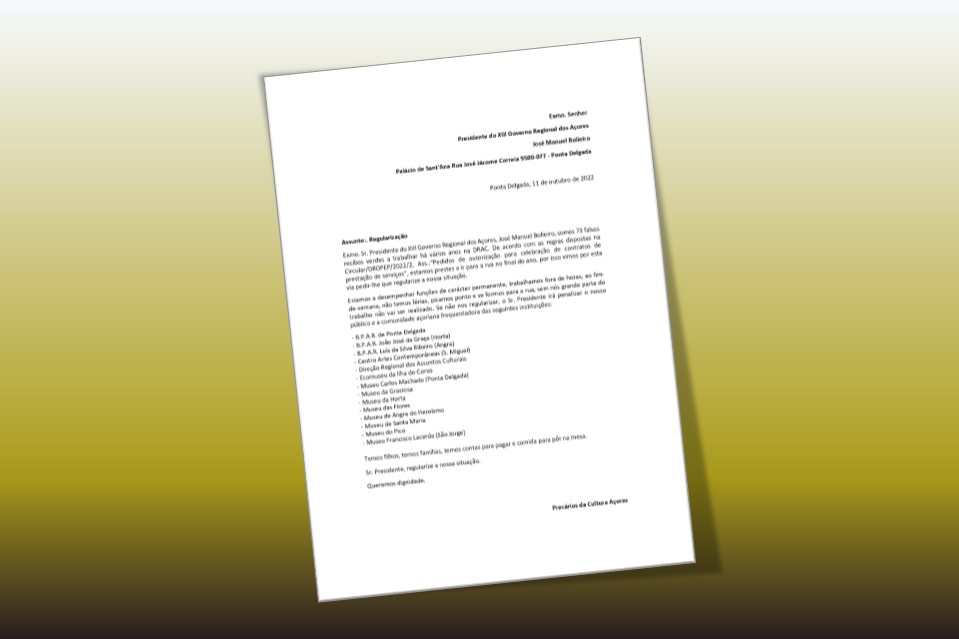 Setenta e três (73) funcionários a “recibos verdes” da Direção Regional dos Assuntos Culturais (DRAC), enviaram esta terça-feira, ao presidente do Governo Regional dos Açores, José Manuel Boleiro, uma carta aberta onde solicitam a “regularização” da sua situação profissional, uma vez que correm o risco de ficarem sem “ganha-pão” no final do ano.