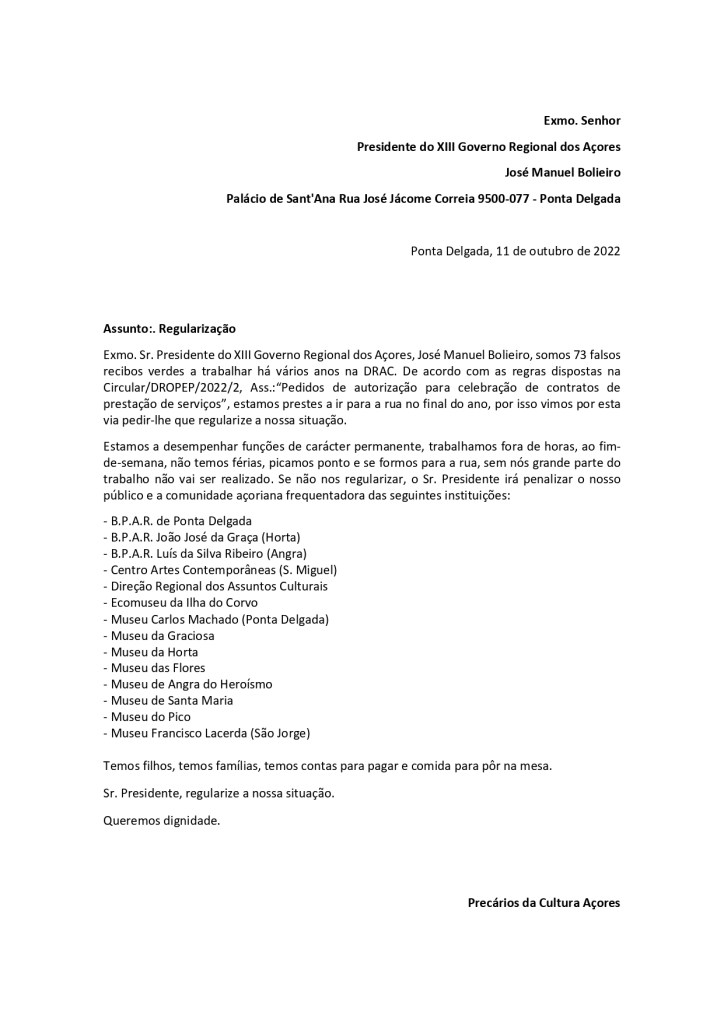 Segundo correio eletrónico enviado aos vários órgãos de informação, com pedido de “celeridade” na publicação da missiva, os 73 funcionários declaram-se “Precários Cultura Açores” e afirmam correr o risco de “ir para a rua no final do ano”, depois de vários anos a servir as mais diversas instituições culturais da região, desempenhando “funções de carácter permanente”, trabalhando “fora de horas” e aos “fins-de-semana”, sem gozo de férias e cumprindo os deveres de assiduidade, tais como todos os outros funcionários da administração pública regional.