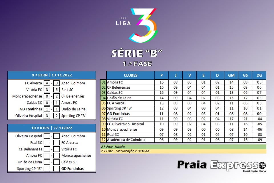 Resultados da 9.ª Jornada, série “B”, da 1.ª Fase da Liga 3, época desportiva 2022/2023, assim como tabela classificativa após realização da mesma.