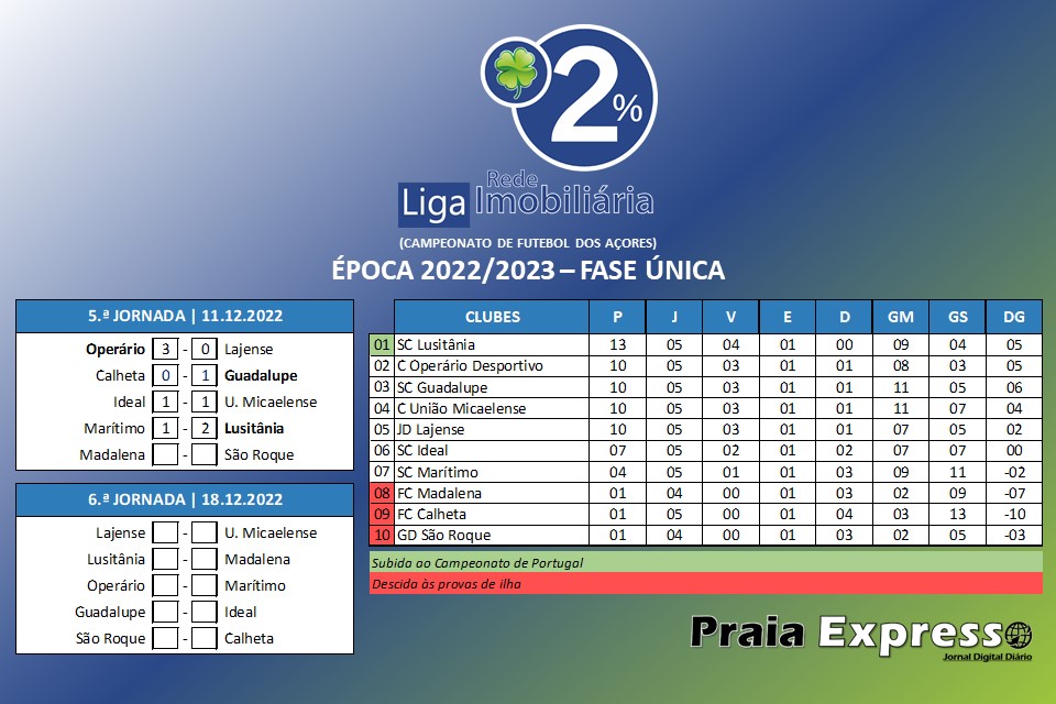 Resultados da 5.ª Jornada da Liga Imobioliária 2% (Campeonato de Futebol dos Açores) assim como tabela classificativa após a realização da mesma.