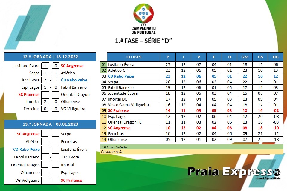Resultados da 12.ª jornada e respetiva tabela classificativa após realização da mesma, referentes à série “D”, da 1.ª Fase do Campeonato de Portugal, época 2022/2023.