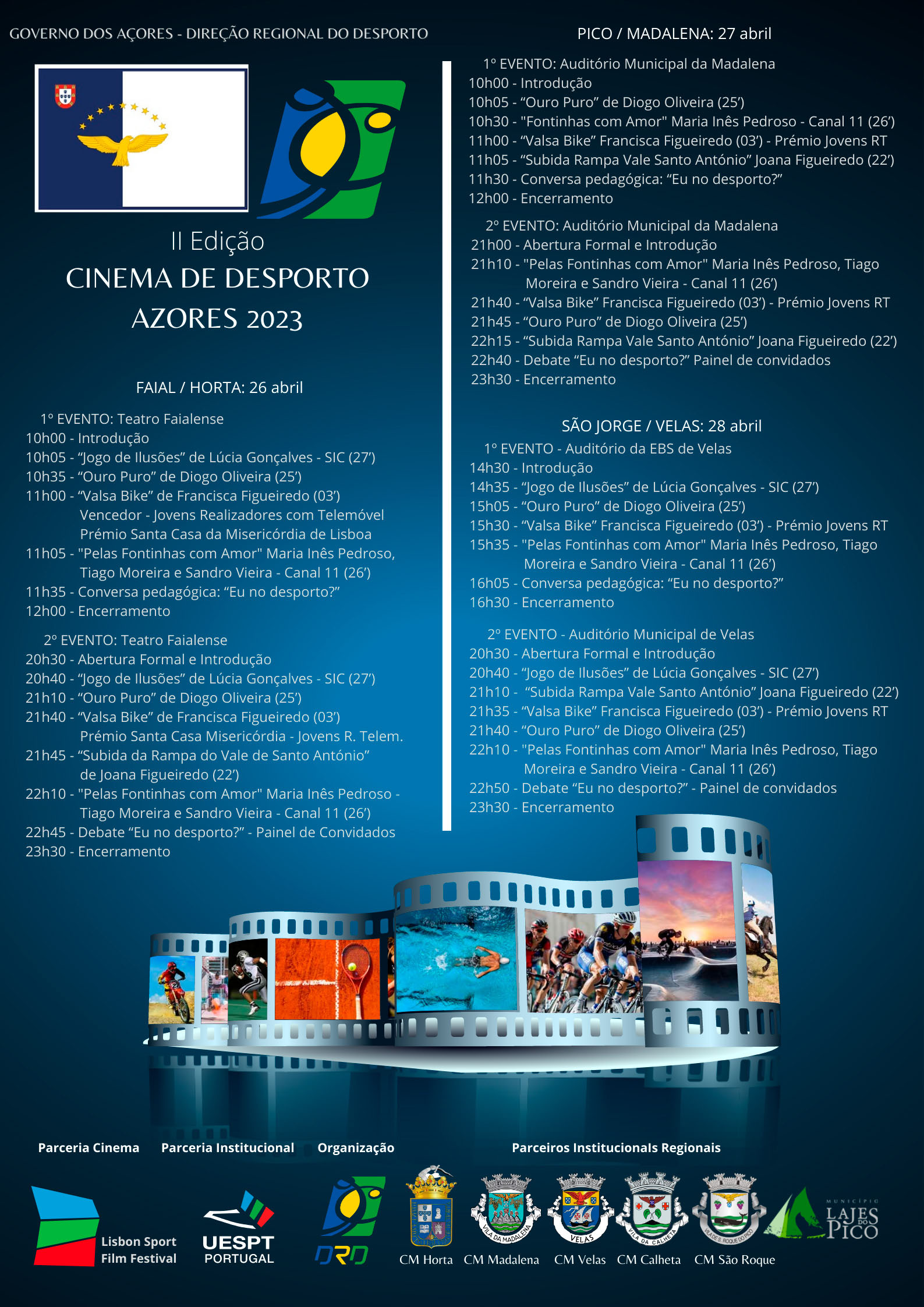 A Secretaria Regional da Saúde e Desporto, através da Direção Regional do Desporto, promove a segunda edição do evento “Cinema de Desporto Azores” que este ano acontece nas ilhas do Faial, Pico e São Jorge, nos dias 26, 27 e 28 de abril, respetivamente, com parceria da UESPT Portugal (Union Européenne du Sports pour Tous), no contexto do Lisbon Sport Film Festival, foi esta quarta-feira revelado.