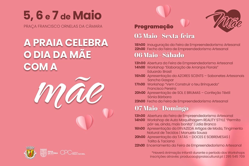 A Câmara Municipal da Praia da Vitória, através da Cooperativa Praia Cultural, organiza, de 05 a 07, a “Praia celebra o Dia da Mãe”, uma feira dedicada ao empreendedorismo, que pretende divulgar projetos empresariais em curso na ilha e assinalar o Dia da Mãe, que se comemora no domingo, dia 07.