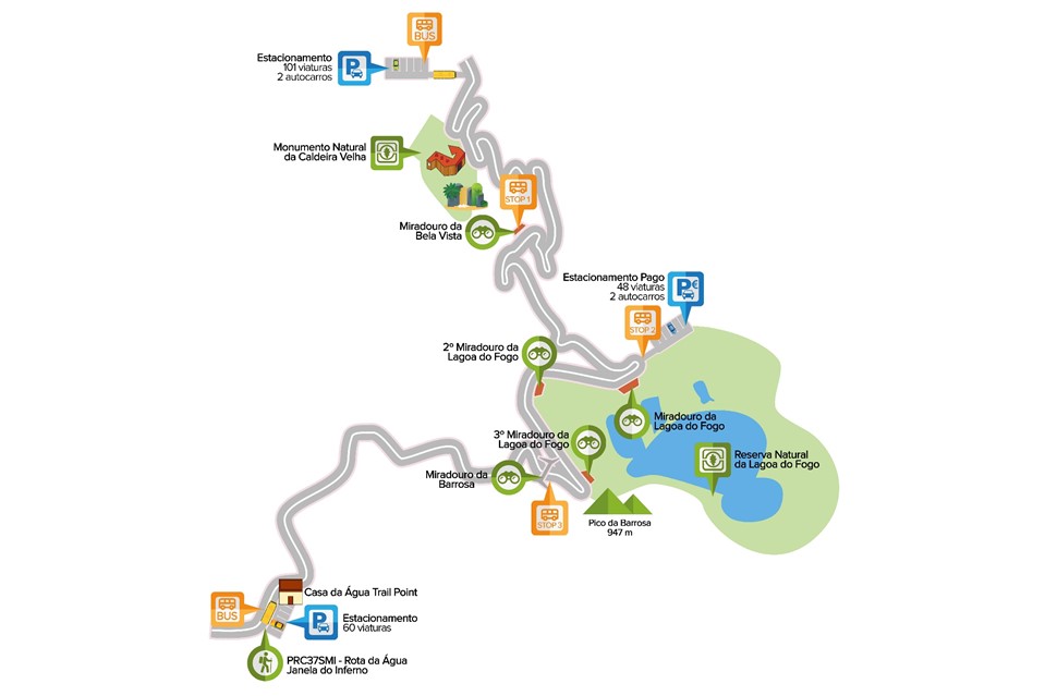 O parque de estacionamento da Caldeira Velha (101 lugares) e o parque de estacionamento junto à Casa da Água (60 lugares) foram incrementados em mais 30 lugares cada. A utilização do parque no miradouro da Lagoa do Fogo (48 lugares) manter-se-á gratuito nos primeiros 20 minutos e sujeito a atualização tarifária nos períodos seguintes. No total, estarão disponíveis cerca de 200 lugares de estacionamento para apoio.