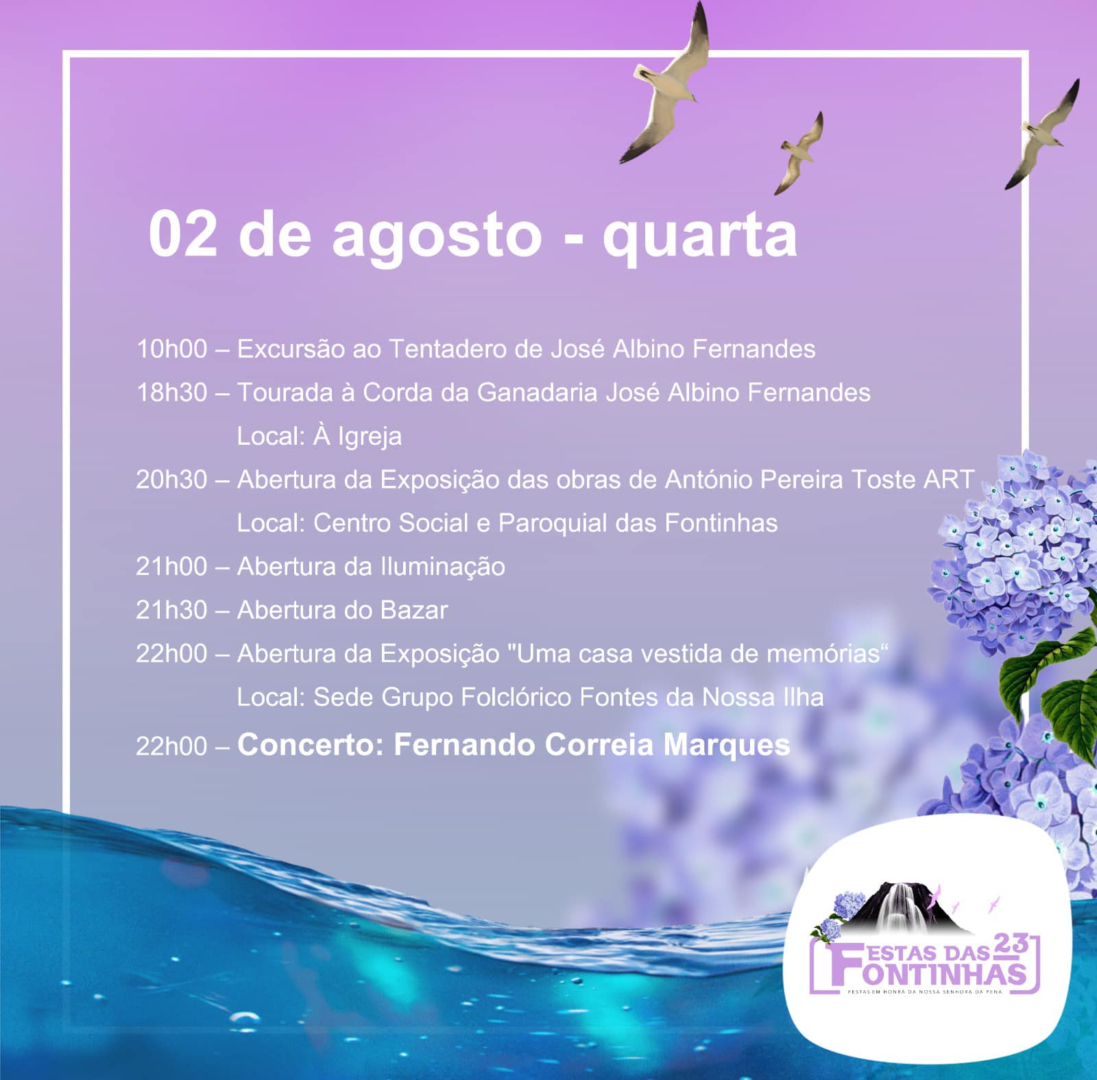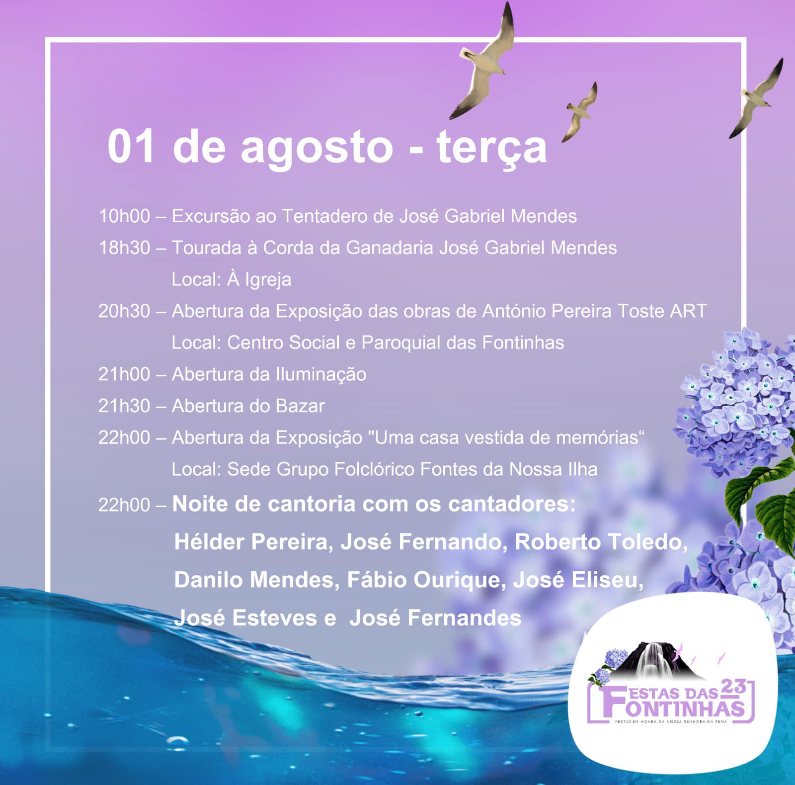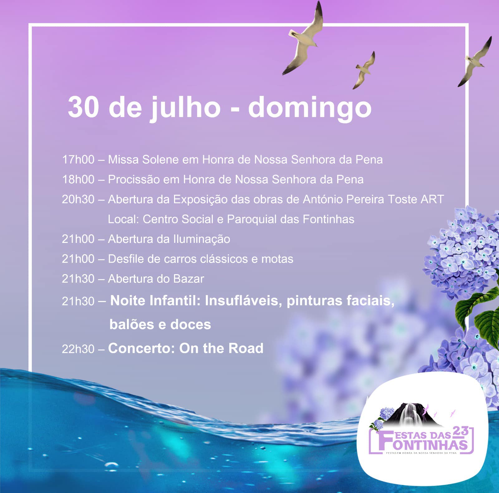 As festas em honra de Nossa Senhora da Pena, na freguesia de Fontinhas, concelho da Praia da Vitória, têm início este sábado, 29 de julho, e decorrem até ao próxima sexta-feira, dia 04 de agosto, subordinadas ao tema “Fontinhas, da terra às suas fontes”.