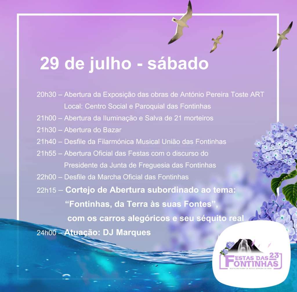 Destaque, na noite de hoje, para o cortejo de abertura (“Fontinhas, da terra às suas fontes”) com desfile dos carros alegóricos e séquito real. Antecede o cortejo de abertura o desfile da sociedade filarmónica local e da marcha oficial das festividades cuja letra é de Hélder Pereira e a música de Gualter Silva, sendo a coreografia da responsabilidade de Joana Silva e o guarda-roupa de João Pedro Andrade.