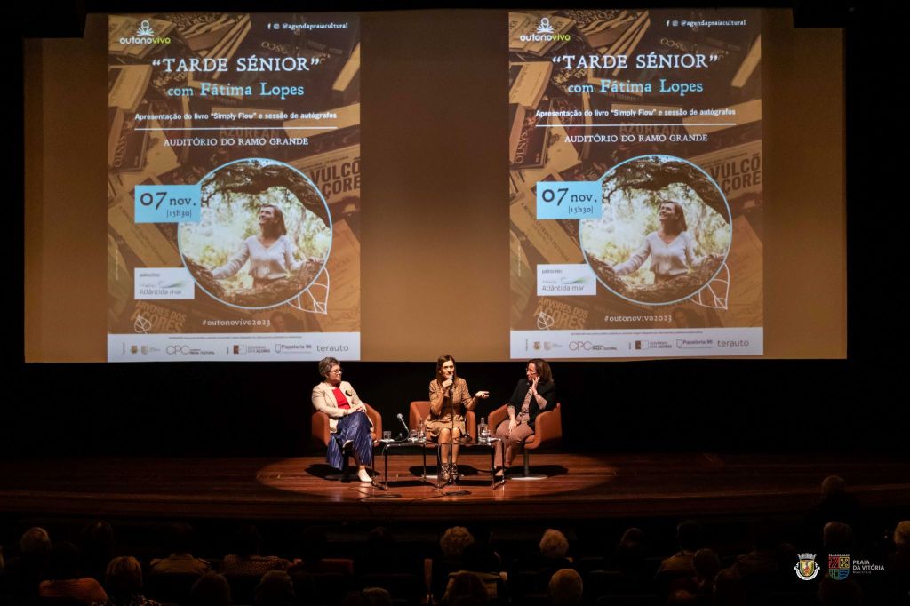 No âmbito do certame Outono Vivo, a Câmara Municipal da Praia da Vitória promoveu, na terça-feira, dia 07, uma tarde sénior com a escritora Fátima Lopes, integrada na apresentação do livro “Simply Flow”, que contou a presença de cerca de centena e meia de idosos do Concelho, no Auditório do Ramo Grande.