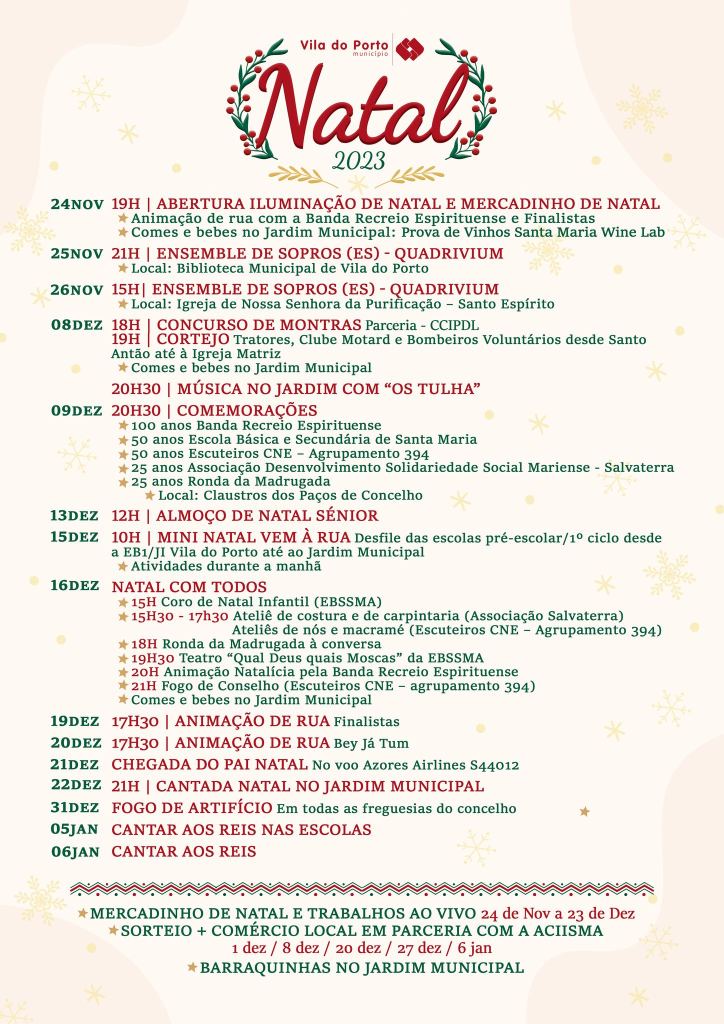 O Município de Vila do Porto apresenta um conjunto de ações para celebrar o Natal de 24 de novembro de 2023 a 6 de janeiro de 2024 com atividades para todas as gerações.