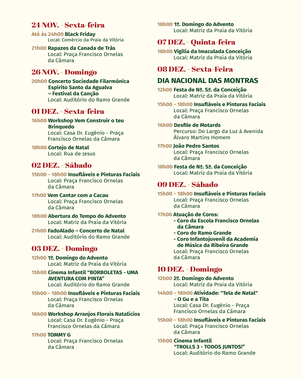 Para o domingo, dia 17, estão agendadas as atividades Puzzle da Família e Meia de Natal, promovidas pelo colégio Gu e Tita entre as 14h00 e as 18h00 na Casa Dr. Eugénio; o cinema infantil Wish: o poder dos desejos, no Auditório do Ramo Grande (15h00); o Cortejo de Natal (18h00) pela Rua de Jesus, seguido de bolo de chocolate na praça. Na Matriz, às 12h00 e às 18h00, decorrerão as cerimónias do 3º domingo do Advento.
